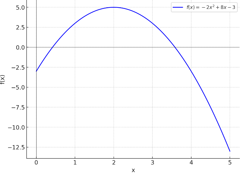 La gráfica también muestra que esta función alcanza un máximo en su vértice, lo cual es característico de las funciones cóncavas hacia abajo. En este caso, ese máximo ocurre en el punto x=2, con el valor máximo de f(x)=5.